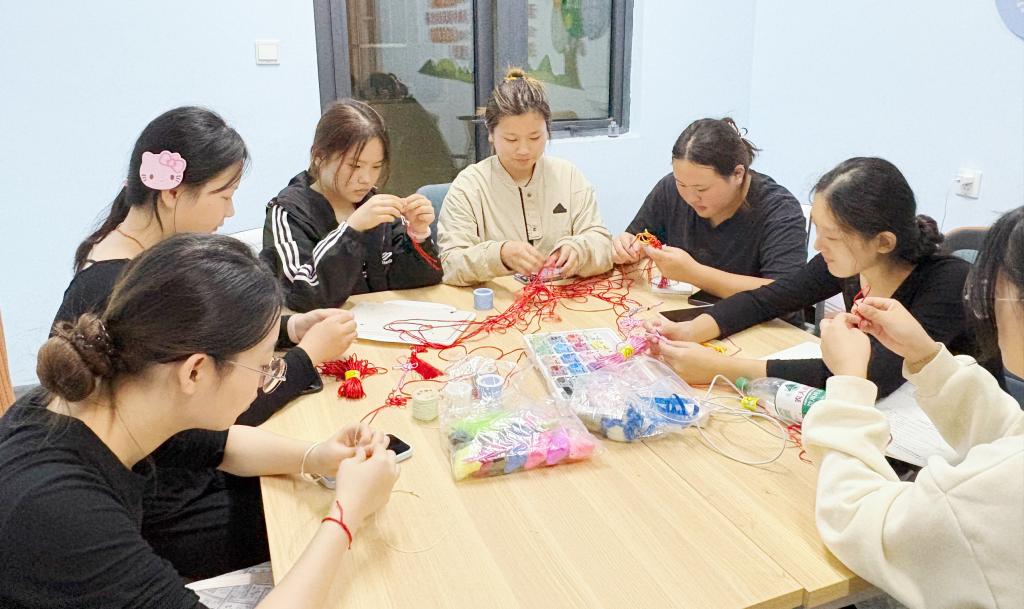 2025年10月16日晚,文教青年“一站式”学生社区内暖意融融,学前教育专业2405班同学们围坐一堂,开展了一场以中国结编织为主题的传统手工艺体验活动。彩绳在指尖流转,古韵于编织中新生,同学们在亲身实践中感受着中国传统结艺的魅力,也将文化的温度与同窗的情谊紧密相连。