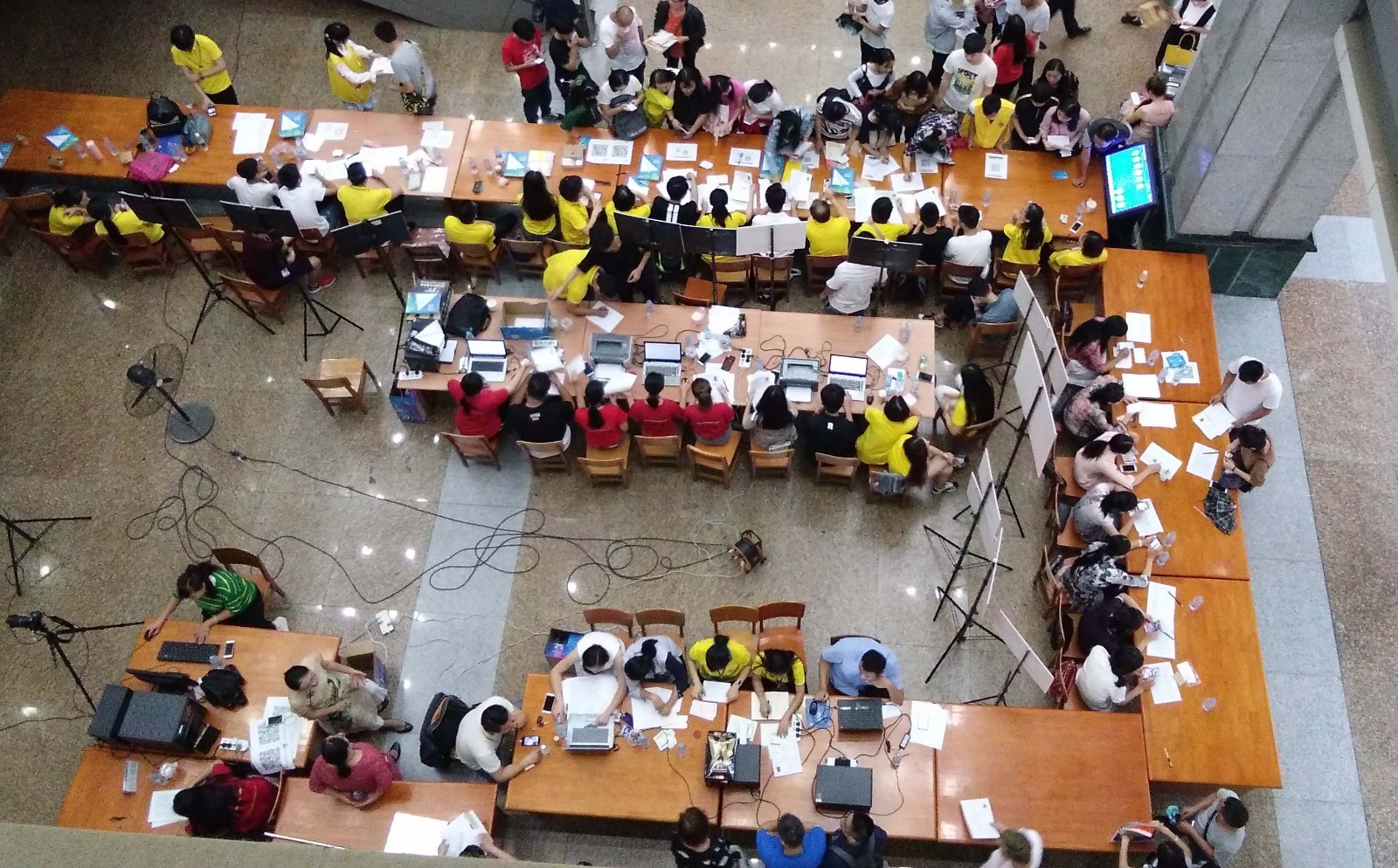 学生会的学生们亮黄色和蓝色的T恤,辨识度极好的让家长新生发现并询问。报到流程十分流利有序,友好的学生们仔细的回答各种问题,得到家长新生的好感。