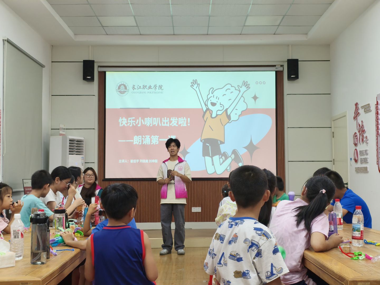 第三堂课充分发挥学院播音与主持专业优势,由翟佳宇、刘佳美同学带来专业朗读课。她们从基础发音技巧入手,通过生动示范和一对一指导,教授孩子们正确的呼吸方式、声调控制与情感表达。“发音时张开口腔,注意舌位……”在专业引导下,孩子们认真聆听、反复练习,从生疏到逐渐流畅,发音更规范,朗读也更自信。这堂语言艺术课有效提升了孩子们的语言表达能力,让他们领略了汉语韵律之美,激发了浓厚兴趣。